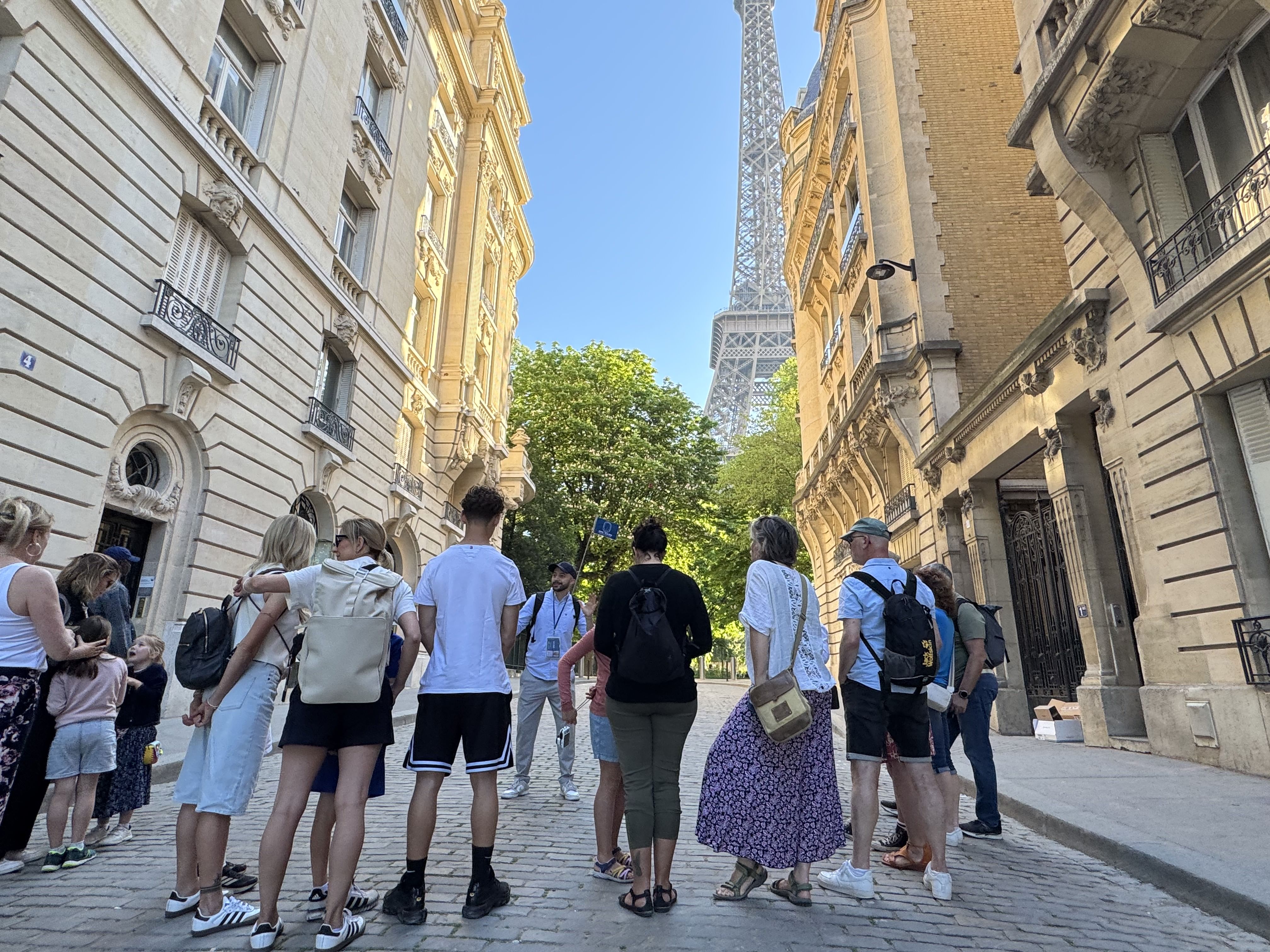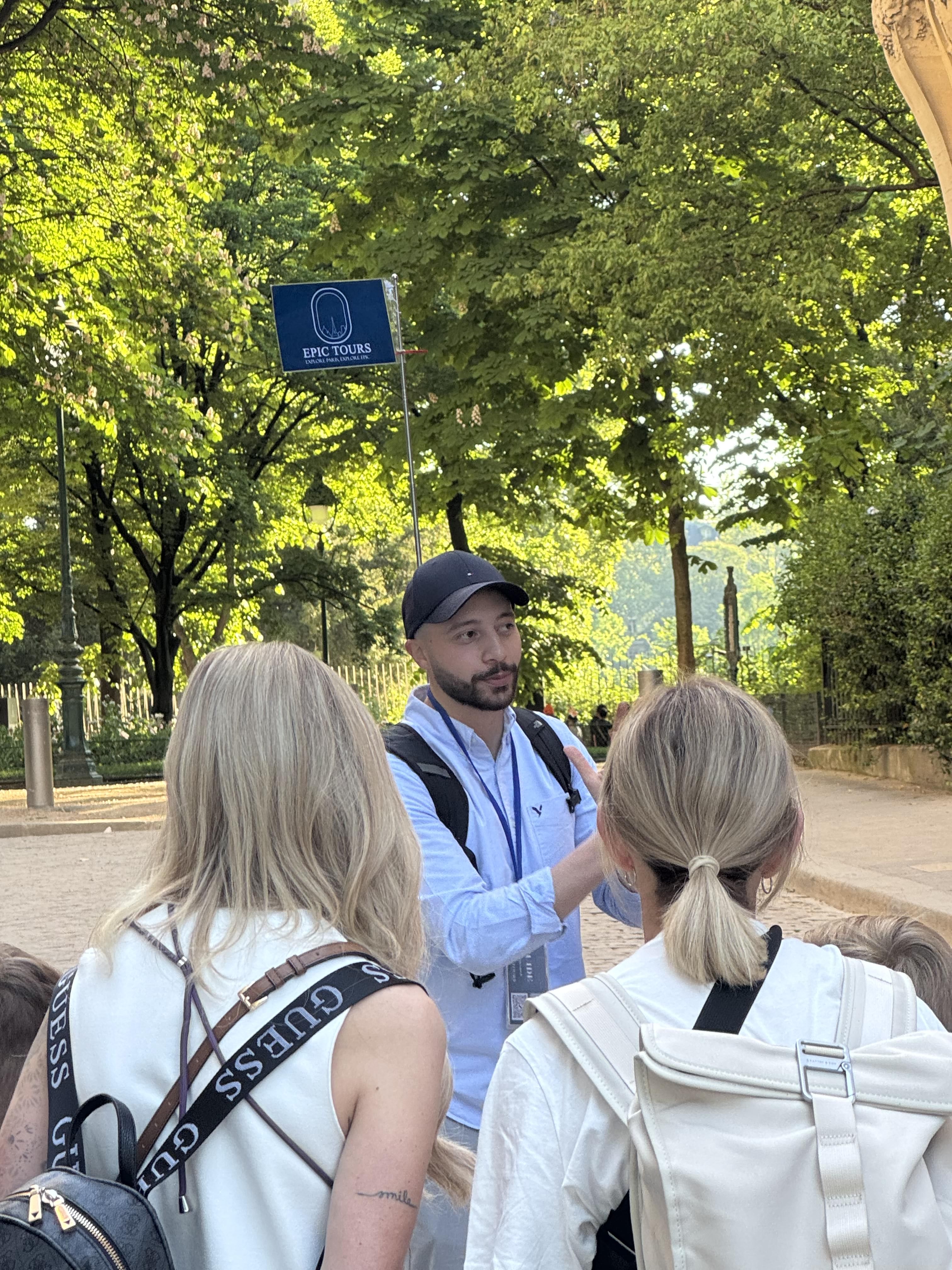 (next to Castel Café). This is a small street directly facing Entrance 1 of the Eiffel Tower. Look for our guide holding a blue sign that says “Epic Tours.”